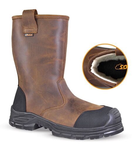 Botte de sécurité, style outdoor, adaptée au secteur du bâtiment. Coloris marron / noir. Hauteur de la tige 25 cm (pointure 42). Munie de deux tirants latéraux en cuir pour faciliter le chaussage. ...