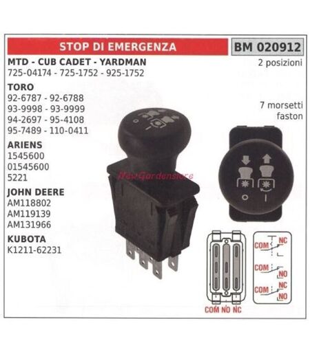 jl BOUTON DE SECURITE pour moteur MTD- CUB CADET - YARDMAN 725-041147 - 725-1752 - 925-1752 TORO 92-6787 - 92-6788 93-9998 - 93-9999 94-2697 - 95-4108 95-7489 - 110-0411 ARIENS 1545600 01545600 5221 JOHN DEERE AM118802 AM119139 AM131966 KUBOTA K1211-62231 2 POSITIONS 7 FASTON CLAMPS Code d'origine : AT ...
