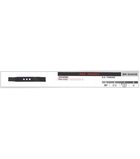 Lames pour tondeuses à gazon, lames pour coupe-bordures BRM 1040P A : 397 mm B : Ø 10mm C : Ø 10.4-13x7mm D : 55mm A : longueur en mm B : trou central C : trous latéraux D : entraxe IKRA - MOGATEC Code : 044036 Code original : 77000288 AT ...