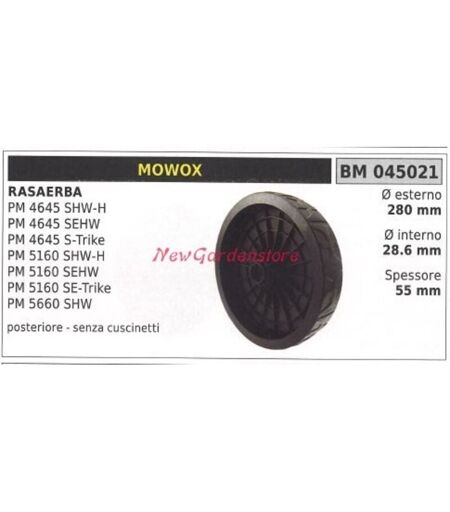 ROUE ARRIERE POUR TONDEUSE POWER HARROWER PM 4645 SHW-H 4645 SEHW 4645 S-TRIKE 5160 SHW-H 5160SEHW 5160 SE-TRIKE 5660 SHW Ø EXTERIEUR : 280mm Ø INTERIEUR : 28.6mm EPAISSEUR : 55mm MOWOX Code : 045021 Pièce détachée originale : AT ...