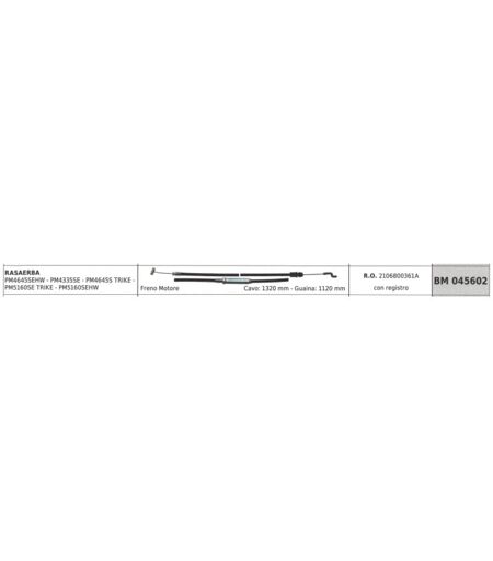 CABLE DE FREIN MOTEUR avec dispositif de réglage compatible MOWOX pour TONDEUSE À GAZON MODELES DE TONDEUSE A GAZON PM4645SEHW - PM4335SE PM4645S TRIKE - PM5160SE TRIKE PM5160SEHW TAILLE DU CÂBLE : 1320 mm Gaine : 1120 mm Réf. : 045602 CODE ORIGINAL : 2106800361A EM ...