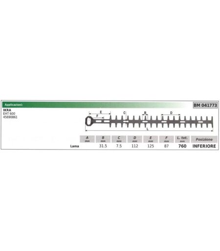 EHT 600 LAME SUPÉRIEURE 45690861 A : B : 31.5mm C : 7.5mm D : 112mm E : 125mm F : 87mm LONGUEUR TOTALE : 760mm Code IKRA : 041773 Code original : AT ...