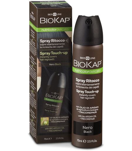 Le spray colorant Biokap permet de conserver une couleur uniforme entre deux colorations tout en prenant soin de ses cheveux.Grâce à sa formulation naturelle riche en ingrédients végétaux, huile d’argan et complexe TRICOREPAIR, vos cheveux sont hydratés et protégés. Composé à 94% d’ingrédients d’origine naturelle, le Spray Retouche Nutricolor Delicato couvre instantanément la repousse de vos cheveux blancs et offre une longue tenue.BénéficesVeganSans ammoniaqueSans résorcine ni parabeneIndicationSpray retouche colorationApplicationBien secouer le flacon. Vaporiser le produit de façon uniforme à une distance de 15cm des cheveux. Appliquer avec parcimonie. Laisser sécher 1 minute. Peigner doucement les cheveux pour un effet plus naturel.Vous avez tâché votre peau ? La couleur peut s’enlever avec du savon.Disparaît au premier shampoing. NE TACHE PASIngrédientsLe complexe TRICOREPAIR contient des protéines de riz à l’action restructurante et régénérante semblable à la kératine, un dérivé de saule qui protège la couleur des rayons UV et de la décoloration et des acides lipophiles de fruits qui protègent le cuir chevelu pendant l’application.L’HUILE D’ARGAN aux propriétés hydratantes, émollientes et protectrices, nourrit les cheveux en profondeur et les rend plus souples et lumineux. Le PANTHENOL, vitamine B5, hydrate et protège les cheveux. ...
