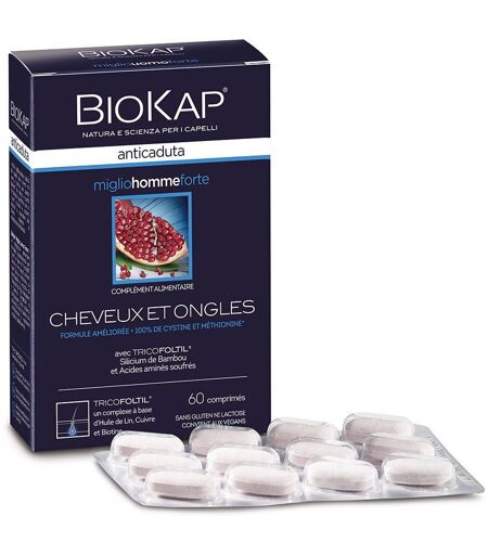Complément alimentaire à utiliser dans le cadre d’une alimentation variée, équilibrée et d’un mode de vie sain.Les raisons de la perte excessive de cheveux sont différentes chez les hommes et les femmes, c’est pourquoi les compléments alimentaires antichute BioKap sont disponibles sous deux formulations spécifiques, qui associent un “cœur” commun et des nutriments spécifiques pour répondre à des besoins nutritionnels différents.L’une des principales causes de la chute des cheveux chez les hommes est la transformation excessive de la testostérone en dihydrotestostérone (DHT), qui peut être causée par des facteurs génétiques, sociaux et environnementaux. Une cure est conseillée en cas de chute excessive de cheveux, manque de vitalité ou lorsque les cheveux s’affinent.BénéficesSans glutenSans lactoseIngrédientsLa formulation MiglioHommeForte est enrichie en :– Extrait de grenade à l’action antioxydante. Des études ont prouvé que la grenade permet d’accroitre la masse capillaire et limite l’inflammation de la papille dermique.– Taurine, un puissant vasodilatateur qui améliore ainsi la microcirculation au niveau du bulbe pileux– Sérénoa qui limite l’action de l’enzyme 5 alpha réductaseConseils d'utilisationDeux comprimés par jour, à prendre avec un peu d’eau ou un autre liquide, de préférence pendant les repas.Poids net60 comprimésAdresse du FabricantALMABIO Distribution1988 Route de l’Almanarre83400 HYERES ...