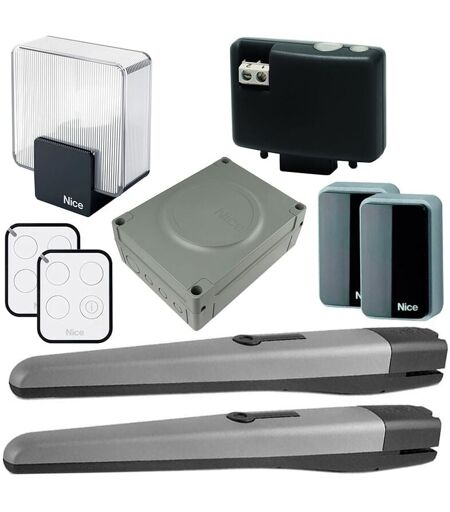 Description générale Kit pour l'automatisation de portails battants avec vantaux jusqu'à 3 mètres, alimenté en 24 Vdc, conçu pour un montage extérieur et idéal pour un usage résidentiel. Ce système comprend un motoréducteur électromécanique avec un encodeur magnétique, garantissant fiabilité et durabilité grâce à sa construction robuste en aluminium laqué polyester, résistant aux conditions climatiques. Le kit est également préparé pour une installation solaire avec le système Solemyo et permet la gestion à distance via la technologie Nice BlueBUS. Spécifications techniques Alimentation : 24 Vdc Intensité : 5 A Puissance : 120 W Vitesse : 0,016 m/s Force : 1800 N Cycles de travail max : 95 par heure Indice de protection : IP 44 Température de fonctionnement : -20 à +50 °C Dimensions (mm) : 820 x 115 x 105 Poids : 6 kg Compatibilité et accessoires 2 motoréducteurs électromécaniques TO4024 2 télécommandes ON3EBD (433,92 MHz) 1 unité de commande MC824H avec récepteur OXIBD 1 paire de ...