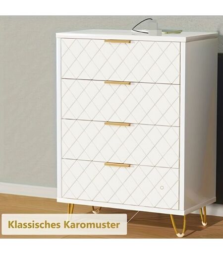 SIFREE Commode 76cm avec 4 Tiroirs en bois, Commode chambre avec Poignées en Métal, pieds dorés, Scandinave - Blanc, Lot de Tables de Chevet avec Station de