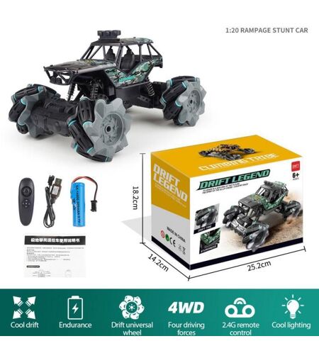 Description:Nom du produit: véhicule tout-terrain 1:20 rampant stuntMatériau du produit: plastique et composants électroniquesTaille du produit: 22 × 16 × 13cMBatterie du corps: 3.7V500mAhTemps de charge: 2-3 heuresMéthode de contrôle à distance: poignéeTemps d'utilisation: 15-20 minutesTaille de l'emballage: 25.2 × 14.2 × 182CMPile de la télécommande: 2 piles ""AA"" de 1.5V (vous devez apporter la vôtre)Couleur du produit: orange, vertDistance de contrôle à distance: 30-40 mètresCaractéristiques: avant et arrière, gauche et droite horizontalement, rotation gauche 360, rotation droite 360, glissière gauche arrière/glissière droite avant, virage avant gauche/virage avant droit, virage arrière gauche/virage arrière droit, démonstration à une touche, trois lumières clignotantesListe des produits: véhicule tout-terrain * 1, télécommande * 1, batterie * 1, manuel en chinois/anglais * 1, câble de chargement USB * 1Spécifications:Escalade à la dérive, conquérir sauvage, escalade, hors route, herbe, sable et autres terrains à traverser facilementAmortisseur indépendant à quatre roues, adhérence stable, résistance aux chocs et à l'extrusionEscalade facile à 45 °, excellente performance d'escalade, pente facile à contrôler à 45 °Programmation de la télécommande 2.4G, la distance de la télécommande atteint 30-40 mètres, adaptée à la compétition normale multi-joueursEmballage Inclus:Véhicule tout-terrain * 1, télécommande * 1, batterie au lithium * 1, manuel * 1, câble de chargement USB * 1 ...