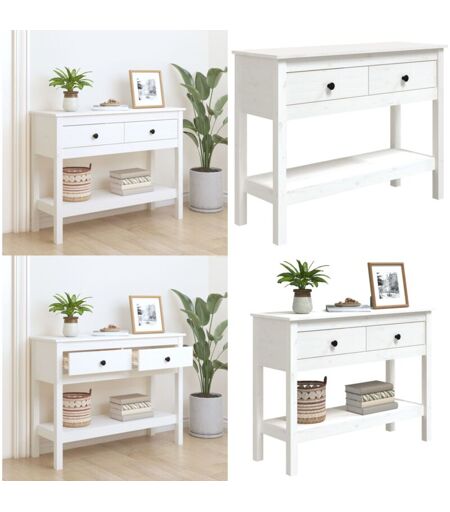 Table console Blanc 100x35x75 cm Bois massif de pin Ajoutez une belle touche à votre pièce avec cette table console en bois classique ! Elle est un supplément pratique et décoratif à votre décoration intérieure. Bois de pin massif : le bois de pin massif est un matériau naturel magnifique. Le bois de pin a un grain droit et les nœuds donnent au matériau son aspect caractéristique et rustique. Cadre stable : le cadre en bois assure robustesse et stabilité. Grand espace de rangement : la table de couloir dispose de 2 tiroirs et d'une étagère ouverte, offrant un grand espace de rangement pour garder vos différents articles essentiels quotidiens bien organisés et facilement accessibles. Dessus robuste : le dessus de cette table d'appoint est parfait pour afficher vos objets décoratifs préférés, cadres photo et plantes en pot. Applications larges : ce bout de canapé convient n'importe où dans votre maison. Il peut être utilisé comme table d'entrée, bout de canapé, table d'accent, table ...