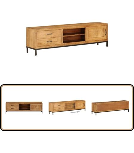VidaXL Meuble TV Bois de manguier massif 140 x 30 x 40 cm Ce meuble TV de style rétro deviendra le point de mire de votre salon ou de votre espace de divertissement. Il peut également être utilisé comme buffet, armoire latérale, etc. Le meuble TV est fait à la main en bois de manguier massif qui est solide, stable, durable et magnifique et la qualité de l'artisanat s'ajoute à son style rétro spectaculaire. Chaque étape du processus est réalisée avec le plus grand soin, que ce soit le polissage, la peinture ou le laquage. La qualité de l'artisanat et les beaux grains de bois rendent chaque meuble unique et légèrement différent l'un de l'autre. Les pieds en acier assurent une grande stabilité. Les 2 étagères et les 2 tiroirs vous offrent suffisamment d'espace pour ranger votre lecteur DVD, console de jeux, appareil de streaming et vos supports multimédia. Remarque importante : Les couleurs varient d'une pièce à l'autre, ce qui rend chacune de nos armoires TV unique. La livraison est ...