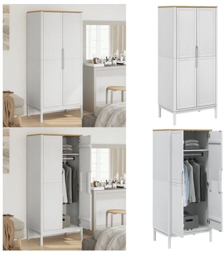 Garde-robe FLORO blanc 77x53x171 cm bois massif de pin Cette garde-robe classique en bois offre un grand espace de rangement pour garder vos vêtements, chaussures et accessoires bien rangés. Matériau durable : le bois de pin massif est connu pour sa résistance et sa durabilité. Ses grains droits et ses nœuds distinctifs contribuent à son charme rustique. Grand espace de rangement: le placard est équipé d'un rail intérieur pour suspendre vos vêtements. Portes pratiques : gardez vos essentiels à l'abri de la poussière en les cachant derrière les portes. Attention : Pour éviter qu'il ne bascule, ce produit doit être utilisé avec le dispositif de fixation murale fourni. Vos avantages Cette garde-robe classique en bois offre un grand espace de rangement pour garder vos vêtements, chaussures et accessoires bien rangés. Autres spécifications Couleur : blanc Matériau : bois de pin massif avec finition à la cire, bois d'ingénierie Dimensions : 77 x 53 x 171 cm (l x P x H) Dimensions de la ...