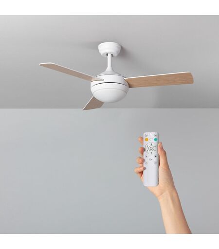 Le ventilateur de plafond extérieur silencieux blanc Navy 40W possède une option à integrer une source lumineuse LED et CCT de 15W. Il a un aspect élégant et classique, ce qui en fait un élément décoratif et fonctionnel. Le ventilateur intègre un moteur à courant continu qui se distingue par sa légèreté, sa durabilité, son efficacité et sa faible consommation d'énergie . Certains des avantages d'un ventilateur avec moteur à courant continu par rapport à un ventilateur avec moteur à courant alternatif sont : -Ventilateur extrêmement silencieux et sans oscillation . Grâce à son moteur à courant continu, nous parvenons à réduire le bruit émis par le ventilateur jusqu'à 50 % par rapport aux moteurs à courant alternatif, ce qui rend le ventilateur parfait pour les salles de repos, d'étude et de travail. - Faible consommation . Les ventilateurs équipés d'un moteur à courant continu consomment jusqu'à 70 % d'énergie en moins par rapport à ceux équipés d'un moteur à courant alternatif, ce qui représente une économie sur la facture d'électricité de notre maison. - Ils démarrent, changent de vitesse et s'arrêtent plus rapidement . De plus, ils intègrent 6 modes de vitesse par rapport aux 3 ou 4 vitesses des moteurs AC. - Il dispose également d'un indice de protection IP44 qui rend ce ventilateur résistant à la poussière et aux projections d'eau, et peut être installé aussi bien à l'intérieur qu'à l'extérieur. Il dispose d'une télécommande , avec 6 fonctions :- Allumé et éteint- Sélection de la température de couleur (Chaud-Neutre-Froid) (Modèles avec éclairage)- Régulation de la lumière (Modèles avec éclairage)- 6 vitesses- Minuterie 1/2/4 heures- Fonction été/hiver Grâce à la technologie Dual Air ou Reverse System, nous fournissons au ventilateur 2 modes de fonctionnement (été/hiver). Avec ce système, le sens de rotation du moteur et des pales est inversé, réussissant à dissiper l'air chaud en été et à répartir uniformément la chaleur du chauffage en hiver, ce qui améliore la sensation thermique, optimise le fonctionnement du chauffage et contribue à l'économie d'énergie. Les modèles avec éclairage intègrent une lumière LED CCT , qui nous permet de changer la température de couleur entre 3 types de lumière (lumière chaude, lumière froide et lumière neutre) et de créer différents environnements selon les besoins. Pour synchroniser le driver avec la télécommande, branchez le ventilateur sur le secteur et appuyez sur la touche ON/OFF de la télécommande pendant 8 secondes. Le ventilateur de plafond Navy Blanc est un moyen parfait pour garder les pièces de votre maison fraîches et lumineuses sans avoir à installer un climatiseur. Que signifie CCT (corrélation de la température de couleur) ? Lorsqu'un produit est marqué CCT, cela signifie qu'il est possible de modifier la température de couleur. La TCC est définie en degrés Kelvin, selon la perception de la couleur d'une LED blanche par l'¿il humain, nous pouvons différencier 3 types de couleurs : une lumière... ...