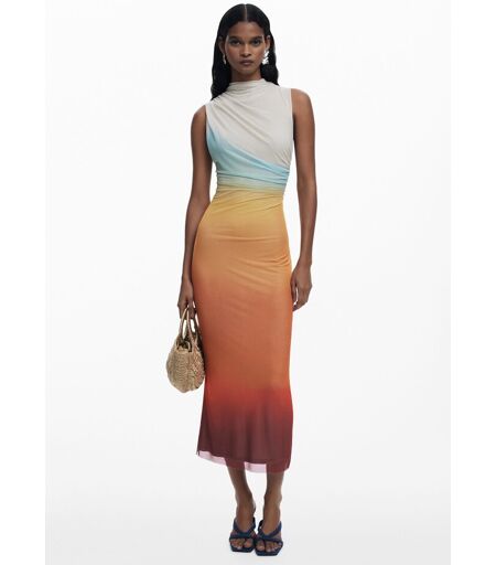 Robe midi en tulle, sans manches, col rond et drapé frontal avec dégradé de couleurs. Dégradé de couleurs Coupe : Slim Sans manches Longueur : Midi Polyester recyclé ...