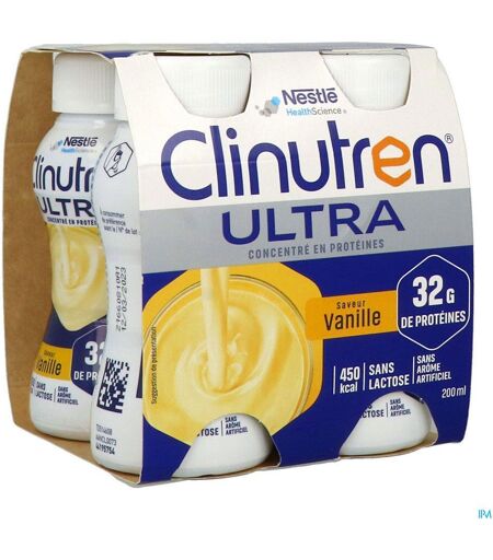 Il est important d'avoir une alimentation variée et équilibrée et un mode de vie sain.Clinutren® Ultra Vanille est une denrée alimentaire destinée à des fins médicales spéciales, recommandée pour la nutrition orale des adultes en cas de dénutrition. Avec 32 g de protéines et 450 kcal par bouteille de 200 ml, c’est la formule la plus concentrée en protéines de la gamme Clinutren®. Elle est sans lactose, sans gluten et sans arôme artificiel. Elle contient des protéines de lactosérum et de lait, des glucides, des lipides et un complexe complet de vitamines et minéraux. Saveur vanille.IngrédientsEau, protéines de lactosérum (LAIT), protéines de LAIT, huile de colza, sirop de glucose déshydraté, saccharose, minéraux (chlorure de chrome, sulfate de cuivre, sulfate ferreux, citrate de magnésium, phosphate de magnésium, sulfate de manganèse, chlorure de potassium, iodure de potassium, fluorure de sodium, molybdate de sodium, sélénate de sodium, phosphate de calcium, sulfate de zinc), émulsifiant : E471, stabilisants : E460, E466, correcteurs d'acidité : E330, E525, agent antimoussant : E471, vitamines : niacine, A, thiamine, B12, riboflavine, acide pantothénique, B6, biotine, acide folique, C, D, E, K, arôme naturel.Allergènes : LAIT.Allergènes : Lait.Valeurs nutritionnelles Pour 200 ml Énergie450 kcal / 1882 kJ Lipides22,4 g Acides gras saturés2,4 g Acides gras mono-insaturés13,4 g Acides gras poly-insaturés5,2 g Glucides30 g Dont sucres18 g Lactose< 0,5 g Protéines32 g Sel0,74 g Sodium300 mg Potassium460 mg Chlorure260 mg Calcium420 mg Phosphore350 mg Magnésium60 mg Fer3,6 mg Zinc3,8 mg Cuivre0,6 mg Manganèse0,38 mg Fluorure0,4 mg Sélénium20 µg Chrome17 µg Molybdène40 µg Iode44 µg Vitamine A240 µg-RE Vitamine D3,6 µg Vitamine E4,4 mg Vitamine K32 µg Vitamine C46 mg Vitamine B1 (Thiamine)1,3 mg Vitamine B2 (Riboflavine)1 mg Niacine1 mg / 9 mg-NE Vitamine B60,7 mg Acide folique108 µg Vitamine B122,4 µg Biotine10 µg Acide pantothénique1,4 mg Contenu en eau66 g Conseils d'utilisationAgiter avant emploi. Consommer frais, de préférence en collation ou pendant un repas. 1 à 2 bouteilles par jour selon avis médical.Précautions d'emploiÀ utiliser sous contrôle médical. Ne pas utiliser par voie intraveineuse. Ne convient pas aux enfants de moins de 14 ans. Utiliser avec précaution en cas d’insuffisance rénale. Tenir hors de portée des enfants.Poids net4 bouteilles de 200 ml = 800 mlAdresse du FabricantNestlé Health ScienceAvenue Gustave EiffelCS 9000077610 Neufmoutiers-en-Brie – France ...