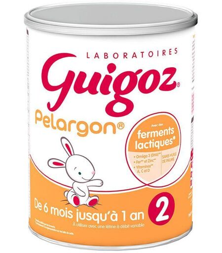 Il est important d'avoir une alimentation variée et équilibrée et un mode de vie sain.La formule GUIGOZ® Pelargon® 2 répond aux besoins nutritionnels spécifiques de votre bébé dès 6 mois et jusqu'à 1 an, dans le cadre d'une alimentation diversifiée*.Des acides gras essentiels de la famille des Oméga 3, dont le DHA* (acide docosahexaénoïque), un acide gras polyinsaturé issu de l'huile de poisson et l'acide alphalinolénique (AAL)*, qui contribue au développement normal du tissu cérébral et nerveux.Du Fer* qui contribue au développement cognitif normal, et du Zinc pour une croissance normale.Des vitamines A*, C* et D* qui contribuent au fonctionnement normal du système immunitaire.La formule légèrement acidifiée de GUIGOZ® Pelargon® 2 peut entraîner une augmentation de la fréquence et un ramollissement des selles. Parlez-en à votre médecin.*Conformément à la réglementation sur les laits de suite.IngrédientsLAIT écrémé, huiles végétales (tournesol riche en acide oléique, colza, tournesol), maltodextrine, LACTOSERUM doux déminéralisé, LACTOSE, amidons, huile de POISSON, minéraux (phosphate tricalcique, citrates de calcium, de sodium et de magnésium; chlorure de potassium, sulfates ferreux, de zinc, de cuivre et de manganèse ; iodure de potassium, sélénate de sodium), émulsifiant (lécithine de SOJA), ferments lactiques (S.Thermophilus), vitamines (A, B1, B2, B3, B5, B6, B8, B9, B12, C, D, E, K), culture de L. Reuteri DSM17938*, antioxydants (extrait riche en tocophérols, palmitate de L-ascorbyle), correcteur d'acidité (acide citrique).Sans huile de palme*Sous licence BioGaia AB.Allergènes : Poisson, Soja, Lait.Valeurs nutritionnelles Unités 100g de poudre Pour 100ml** ENERGIE kJ 2095 282 kcal 500 67 LIPIDES g 24,3 3,3 dont acides gras saturés g 2,4 0,3 dont acide linoléique mg 3700 496 dont acide α-linolénique mg 310 41,5 dont acide docosahexaénoïque (DHA) mg 150 20,1 GLUCIDES g 58,8 7,9 dont sucres g 33,3 4,5 dont lactose g 31,5 4,2 Amidon g 9,5 1,3 PROTEINES g 11,5 1,5 Caséines g 5,6 0,8 Protéines de lactosérum g 5,6 0,8 VITAMINES ET MINERAUX Vitamine A µg-ER 432 57,9 Vitamine D µg 13 1,74 Thiamine (B1) µg 560 75,1 Riboflavine (B2) µg 1000 134 Niacine (B3) mg 4,2 0,56 Acide pantothénique (B5) mg 3,6 0,48 Vitamine B6 µg 360 48,2 Biotine µg 14,9 2 Folates µg-EFA 140 18,8 Vitamine B12 µg 2 0,27 Vitamine C mg 100 13,4 Vitamine K µg 40 5,36 Vitamine E mg α-ET 12,5 1,68 Sodium mg 207 27,7 Potassium mg 560 75,1 Chlorure mg 371 49,7 Calcium mg 580 77,7 Phosphore mg 343 46 Magnésium mg 36,6 4,9 Fer mg 6,5 0,9 Zinc mg 3,9 0,52 Cuivre µg 390 52,3 Iode µg 110 14,7 Sélénium µg 25 3,35 Manganèse µg 235 31,5 Fluorure µg <500 <67 100ml** = 3 mesurettes de 4,5g + 90ml d’eauConseils d'utilisationPréparez le biberon juste avant le repas.Utilisez une eau minérale ou une eau de source convenant aux nourrissons.Pour tiédir l'eau, nous vous deconseillons l'emploi du four à micro-ondes en raison du risque de brûlures. Préférez le bain-marie ou le chauffe-biberon.Utilisez... ...