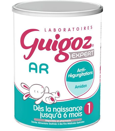 Il est important d'avoir une alimentation variée et équilibrée et un mode de vie sain.Dans les premiers mois de sa vie, l'alimentation de votre bébé est exclusivement lactée.Les laboratoires Guigoz ont mis au point GUIGOZ Expert® AR 1, une formule qui répond aux besoins spécifiques du nourrisson, en relais de l'allaitement maternel.Elle convient à l'alimentation particulière du nourrisson, dès la naissance quand il n'est pas allaité, pour les besoins nutritionnels en cas de régurgitation.Cette formule contient un taux élevé d'amidon capable d'absorber l'eau, provoquant l'épaississement du bol alimentaire au niveau de l'estomac.Cet épaississement est à l'origine d'une diminution significative des régurgitations de votre bébé.Guigoz Expert AR1 est, aussi, hypoallergénique afin d'aider à réduire le risque d'allergie aux protéines de lait de vache.IngrédientsLactose, huiles végétales, amidon, protéines de LAIT partiellement hydrolysées, phosphate de calcium et de potassium, chlorures de magnésium et de calcium et de potassium ; correcteurs d'acidité: hydroxydes de potassium, et de sodium, acides citrique ; maltodextrine, L-arginine, vitamines: C, E, A, niacine, pantothénate de cailcium, D, B1, B2, B6, K, B9, B12, bitine, L-histidine, bitartrate de choline, L-tyrosine, sulfate ferreux, de zinc, de manganèse, taurine, inosital, nucléotides, L-carnitine, culture de Lactobacillus reuteri DSM17938* iodure de potassium, sélénate de sodium.Allergènes : Lait.Valeurs nutritionnellesAnalyse moyennePour 100 gPour 100 ml*Valeur Energétique2146 / 513 kJ / kcal281 / 67 kJ / kcalProtéines9.8 g1.3 gdont Protéines solubles9.8 g1.3 gdont Taurine32 mg4.2 mgdont Carnitine16 mg2.1 mgGlucides59.9 g7.8 gdont Sucres39.3 g5.1 gdont Lactose39.3 g5.1 gdont Amidon20.7 g2.7 gLipides26 g3.4 gdont Acides gras saturés7.4 g1 gdont Acide linoléique4100 mg536 mgdont Acide α-linolenique500 mg65 mgFibres alimentaires0 g0 gSels minéraux2.35 g0.3 gdont Sodium200 mg26 mgdont Potassium550 mg71.9 mgdont Chlorure381 mg49.8 mgdont Calcium353 mg46.1 mgdont Phosphore196 mg25.6 mgdont Magnésium52 mg6.8 mgdont Fer5.3 mg0.69 mgdont Zinc5 mg0.65 mgdont Cuivre0.4 mg0.06 mgdont Iode77 µg10.1 µgdont Sélénium18 µg2.4 µgdont Manganèse110 µg14.4 µgdont Chrome< 20 µg< 2.6 µgdont Molybdène< 20 µg< 2.6 µgdont Fluorure< 60 µg< 7.8 µgVitamines dont A510 µg-ER67 µg-ERdont D6.8 µg0.9 µgdont D272 Ul36 Uldont Thianine0.5 mg0.07 mgdont Riboflavine1.15 mg0.15 mgdont Niacine5.4 mg0.71 mgdont Acide panthothénique4.8 mg0.63 mgdont B60.36 mg0.05 mgdont Biotine11.2 µg1.5 µgdont Acide folique81 µg10.6 µgdont B121.1 µg0.14 µgdont C69 mg9 mgdont K44 µg5.8 µgdont E10 mg α-ET1.3 mg α-ETdont Choline56 mg7.3 mgdont Inositol40 mg5.2 mgdont Nucléotides15 mg2 mg*Valeurs nutritionnelles de référenceConseils d'utilisationLavez-vous les mains avant chaque préparation.Le biberon doit être préparé juste avant le repas. Jetez tout reste de biberon sans hésiter.N’utilisez que la mesurette contenue dans cette boîte.Veillez à bien refermer... ...