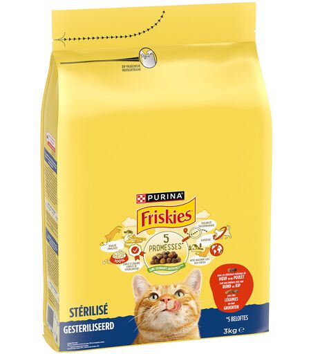 Les croquettes PURINA Friskies Sterilised au bœuf, au poulet et aux légumes sont idéales pour les chats stérilisés. Leur recette a été spécialement conçue pour leur fournir tous les nutriments dont ils ont besoin pour rester heureux, vifs et... ...