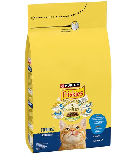 Les croquettes PURINA Friskies Sterilised au saumon, au thon et aux légumes constituent un aliment complet et équilibré, spécialement élaboré pour les chats stérilisés. Elles contiennent tous les nutriments nécessaires pour que votre chat puisse... ...