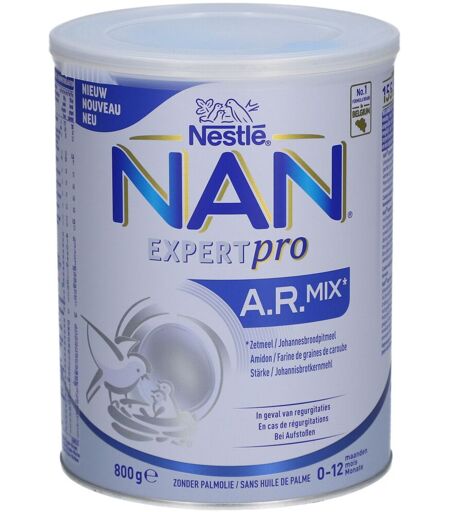 NAN® Expertpro A.R. MIX est un lait enrichi avec un mix d’amidon et de farine de graines de caroube en cas de problèmes de régurgitations. Ce produit convient à l’alimentation particulière des nourrissons dès leur naissance quand ils ne sont pas allaités. Peut être utilisé comme seule source d’alimentation. Il doit être utilisé sous contrôle médical. Ne peut pas être administré par voie parentérale. lait écrémé, lactose, lactosérum déminéralisé (lait), huile de tournesol à taux élevé en acide oléique, huile de colza faible en acide érucique, épaississant : farine de graines de caroube; huile de tournesol, amidon de pomme de terre, citrate de calcium, citrate de potassium, émulsifiant: lécithine de soja, huile de mortierella alpina, huile extraite de la microalgue Schizochytrium sp, chlorure de magnésium, bitartrate de choline, chlorure de potassium, L-phénylalanine, chlorure de sodium, citrate de sodium, phosphate de sodium, vitamines (C, E, niacine, acide pantothénique, A, B1, B6, B2, D, K, acide folique, B12, biotine), amidon de maïs, L. Reuteri*, taurine, sulfate de fer, inositol, L-histidine, sulfate de zinc, nucléotides, L-carnitine, correcteur d’acidité : acide citrique; sulfate de cuivre, sulfate de manganèse, iodure de potassium, sélénate de sodium. *L. culture DSM 17938 Under license from BioGaia AB. Valeur nutritionnelle Pour 100 g de poudre Pour 100 ml de produit préparé Énergie (kJ) 2171 280 Énergie (kcal) 519 67 Matières grasses (g) 28 3.7 dont acides gras saturés (g) 2.8 0.36 dont DHA (mg) 130 17 Glucides (g) 55 7.1 dont sucres (g) 51 6.5 dont lactose (g) 51 6.5 dont amidon (g) 2.3 0.3 Fibres alimentaires (g) 2.7 0.35 Protéines (g) 9.6 1.2 Vitamine A (µg) 460 59.4 Vitamine D (µg) 12 1.5 Vitamine E (mg) 11 1.4 Vitamine K (µg) 40 5.2 Vitamine C (mg) 90 12 Thiamine (B1) (mg) 0.54 0.07 Riboflavine (B2) (mg) 1.1 0.14 Niacine (PP) (mg) 4.1 0.53 Folates (µg) 170 21.9 Vitamine B12 (µg) 1.3 0.17 Biotine (µg) 13 1.7 Acide pantothénique (mg) 3.5 0.45 Sodium (mg) 220 28.4 Potassium (mg) 560 72.3 Chlorure (mg) 395 51 Calcium (mg) 325 42 Phosphore (mg) 180 232 Magnésium (mg) 48 6.20 Fer (mg) 5.5 0.71 Zinc (mg) 5.2 0.67 Cuivre (mg) 0.47 0.06 Manganèse (mg) 0.17 0.02 Fluorure (mg) <0.06 <0.007 Sélénium (µg) 27 3.5 Iode (µg) 110 14.2 Chrome <51,9 <6.7 Molybdène <72,7 <9.40 Choline (mg) 160 20.7 Inositol (mg) 60 7.7 Taurine (mg) 34 4.4 Carnitine (mg) 9.5 1.2 Nucléotides (mg) 15 1.9 Table d'alimentation Âge de l'enfant Eau (ml) Mesurettes1 Repas/24 heures 1ère et 2e semaine 90 3 6 3e et 4e semaine 120 4 5 2e mois 150 5 5 3e et 4e mois 180 6 5 5e et 6e mois 210 7 5 A conserver dans un endroit sec et frais. Contra-indicaties: in geval van allergie aan koemelkeiwitten. Utilisez le contenu de la boîte dans les 3 semaines suivant l’ouverture. Avis important : Le lait maternel est l'aliment idéal pour les bébés au cours des premiers mois. Il est facilement digestible et composé de manière à couvrir les besoins en nutriments et en liquides pendant les six... ...