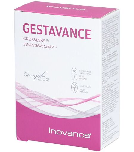 Complément alimentaire à utiliser dans le cadre d’une alimentation variée, équilibrée et d’un mode de vie sain.Inovance® GestavanceComplément alimentaire à base d’huile extraite de la microalgue Schizochytrium sp., de vitamines, de minéraux et de choline.Les folates contribuent à la croissance des tissus maternels durant la grossesse. La supplémentation en acide folique augmente le statut maternel en folates. Un faible statut en folates chez la mère augmente les risques d'apparition d'anomalies du tube neural chez le fœtus en développement (consommation journalière de 400 μg d'acide folique, au moins un mois avant la conception et jusqu'à trois mois après la conception.).Le fer joue un rôle dans le processus de division cellulaire.Les vitamines B2, B6, B12, B9 et le magnésium contribuent à réduire la fatigue.Points forts :Sans allergèneFormule duo-chronobiologie : vitamines et minéraux utiles aux métabolismes liés à l'horloge biologique du matin et les bons acides gras liés à l'horloge biologique du soir.Formulation amino-complexée pour une meilleure assimilation des actifs.L'huile issue d'algue présente toutes les garantis Qualité et Sécurité nécessaires ; elle est labellisée OMEGAVIE ALGUE. Conforme à une alimentation végane.IngrédientsComprimé Vitamines – Minéraux : Carbonate de calcium ; oxyde de magnésium ; bitartrate de choline microencapsulé ; agent de charge : cellulose microcristalline ; bisglycinate ferreux ; hydrolysat de protéines de riz ; acide ptéroylmonoglutamique (vitamine B9) ; antiagglomérants : sels de magnésium d’acides gras et carboxyméthylcellulose de sodium réticulée ; gluconate de zinc ; enrobage (agents d’enrobage : hydroxypropylméthylcellulose, cellulose microcristalline, acides gras) ; nicotinamide (vitamine B3) ; succinate de d-alpha-tocophéryle (vitamine E) ; émulsifiant : mono et diglycérides d’acides gras ; bêta-carotène (vitamine A) ; cyanocobalamine (vitamine B12) ; cholécalciférol (vitamine D) ; chlorhydrate de pyridoxine (vitamine B6) ; chlorhydrate de thiamine (vitamine B1) ; riboflavine (vitamine B2) ; iodure de potassiumCapsule : Huile de microalgue Schizochytrium sp (antioxydants : mélange de tocophérols, extrait de romarin et palmitate d'ascorbyle, émulsifiant : lécithine de tournesol) ; enveloppe d’origine végétale (stabilisant : amidon de maïs modifié IP, humectant : glycérol, gélifiant : carraghénane, régulateur d'acidité : carbonate de sodium).Données nutritionnellesPour 1 comprimé par jour :- Calcium : 240 mg (30%*)- Magnésium : 187.5 mg (50%*)- Choline : 75 mg- Fer : 14 mg (100%*)- Vitamine B9 - Acide folique : 400 µg (200%)- Zinc : 5mg (50%*)- Vitamine B3 :16 mg (100%*)- Vitamine E : 9,0 mg (75%*)- Bétacarotène : Eq 240 μg vit. A (30%*)- Vitamine B12 : 3,0 µg (120%*)- Vitamine D : 5,0 µg (100%)- Vitamine B6 : 1.4 mg (100%*)- Vitamine B1 : 1.1mg (100%*)- Vitamine B2 : 1.4 mg (100%*)- Iode : 150 µg (100%*)*Apports de RéférencePour 1 capsule par jour :- Huile extraite de schizochytrium sp. : 648 mg,... ...