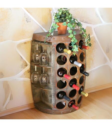 Rack à vin design de haute qualité en bois en forme de tonneau à vin. Le casier peut accueillir jusqu'à 18 bouteilles de vin standard de 0,75 L (pas de bouteilles de 1 L, verres jusqu'à 18 cm). Les bouteilles sont placées dans les emplacements prévus à cet effet, le stockage horizontal empêche le séchage du bouchon et donc l'infiltration d'air. Le casier à bouteilles est livré déjà monté, vous pouvez donc le sortir immédiatement de son emballage et le placer dans votre endroit préféré. Idéal comme cadeau pour les amateurs de vin et un accroche-regard dans chaque salle à manger, salon, cuisine, cave ou cave à vin. Les casiers à bouteilles ont un diamètre de 85 mm. Dimensions: Hauteur 72 cm, largeur 52 cm, profondeur 28 cm . ...