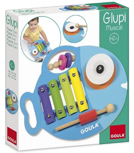 Glupi, le premier jeu musical des tout-petits. Ce jouet d'éveil musical pour bébé inclut 3 instruments à percussion : un xylophone, une cymbale et un güiro. Pratique, sa poignée permet de l'emporter partout ! Glupi musical 3 en 1, un jouet musical pour enfant de la marque Goula. Référence 53143. ...