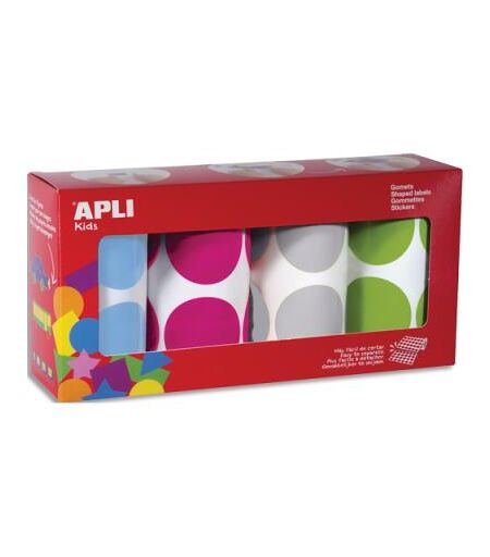 Boîte de 4 rouleaux de gommettes Apli Kids rondes - 45mm - 1416 unités - couleurs assorties bleu, fushia, gris, vert