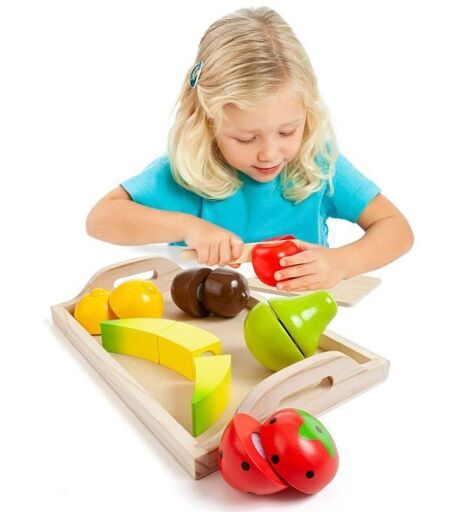 Jeu de fruits en bois avec 8 fruits prédécoupés et un plateau pour les ranger, les transporter et jouer. Inclut un couteau en bois pour apprendre à couper et à préparer de délicieuses présentations de fruits qui feront le bonheur de nos petits. ...