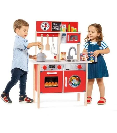 Grand Cuisine jouet en bois avec micro-ondes, évier avec robinet mélangeur, plaque à induction, four avec sélection de la température et commandes de cuisson, machine à laver avec sélection du programme de lavage et 10 autres accessoires pour commencer à jouer. Elle a tout ce qu'il faut pour être le jouet préféré de vos petits, et en plus, elle est super-réaliste. Vous pouvez compléter votre cuisine avec la large gamme de jouets en bois de Molto. La cuisine mesure 85, 5 x 60 x 30 cm. Nos jouets en bois sont fabriqués conformément à la norme FSC, avec des matériaux durables sélectionnés et selon un processus de fabrication éco-friendly. Les jouets en bois Molto Nature sont peints à la main avec des couleurs non toxiques à base d'eau, conformément aux normes de sécurité les plus strictes. ...