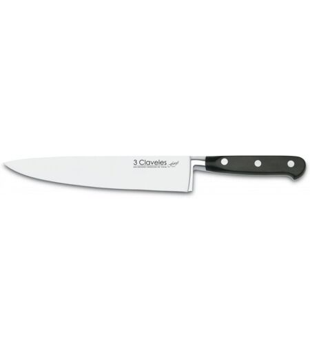 Un couteau de chef 3 Claveles 100% forgé ! Lame en acier inox 54HRC forgée 20cm Manche en POM poli 3 rivets et mitre inox coloris noir Compatible lave-vaisselle : gain de temps assuré Fabrication Espagnole ...