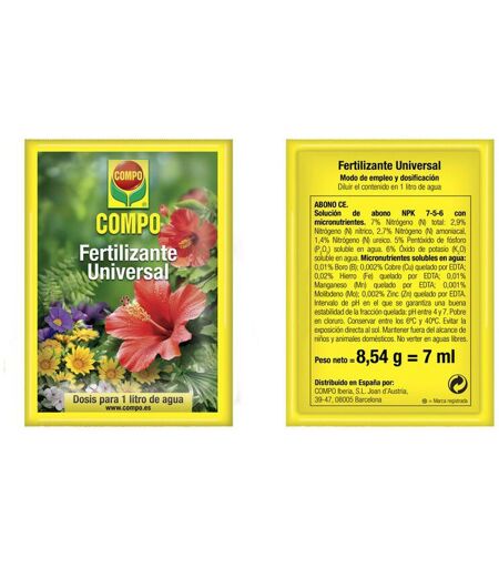 Engrais Liquide Universel Compo Algoflash - Différents Volumes compo. À savoir : la marque Compo est aussi diffusée, selon les pays, sous la marque ALGOFLASH. Ce sont exactement les mêmes produits que vous retrouverez sous ces 2 marques. Spécifications techniques: Il facilite l'absorption des nutriments en retenant l'eau et en stimulant le développement des plantes, ses fleurs ont des couleurs très vives et son arôme est amélioré. Le sol devient plus fertile grâce à l'humus liquide. Présentation: 500 ml. 1 l, 1,3 l Dosage simple grâce au bouchon marqué de niveaux Contient des extraits d'algues Avec stimulateur de protéines naturelles, magnésium et microéléments Protège contre les parasites et les maladies L'eau directement sur le sol en évitant les feuilles À savoir : la marque Compo est aussi diffusée, selon les pays, sous la marque ALGOFLASH. Ce sont exactement les mêmes produits que vous retrouverez sous ces 2 marques. ...