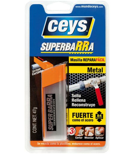 Ceys Superbar Repaira Metal 47g. Mastic Moulable À 2 Composants Présenté Dans Un Bâton, Qui Réagit Lorsqu'il Est Mélangé. Indiqué Pour Réparer, Reconstruire, Remplir, Réparer Et Sceller Toutes Sortes De Matériaux De Façon Permanente. Application Facile: Il Se Mélange Comme La Pâte À Modeler, Durcit Comme L'acier En Quelques Minutes. Ils Durcissent Sous L'eau. Ils Peuvent Être Poncés, Percés, Polis Et Peints. Résistance Mécanique: Jusqu'à 180kg/Cm². Résistance Thermique: De -300 À + 1800c. Résistance Chimique: À L'eau, Aux Huiles, Aux Solvants Et Aux Produits Chimiques. Une Fois Durcis, Ils Ont Les Mêmes Propriétés Que Le Matériau Qu'ils Réparent. ...