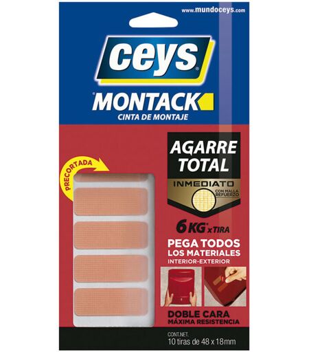 Ruban de montage prédécoupé montack, double face, avec une grande résistance et une adhérence immédiate, pour intérieur et extérieur. charge maximale 6 kg par bande. contient 10 bandes de 48 x 18 mm ...
