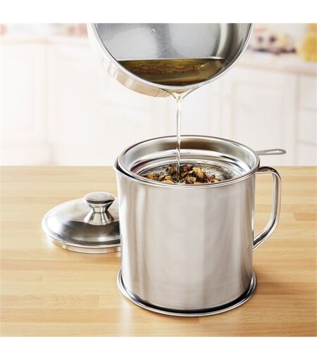 Pour faire des économies, il est possible de réutiliser l’huile de friture seulement si celle-ci est conservée dans de bonnes conditions. Ce conservateur bien conçu est donc celui qu’il vous faut ! Comment conserver l’huile de friture ? Ce conservateur intègre un filtre et un couvercle, pour préserver dans de bonnes conditions d’hygiène l’huile de cuisson jusqu’à sa prochaine utilisation. Versez l’huile à travers le filtre pour enlever les impuretés et les résidus de friture puis refermez avec le couvercle avant de la placer dans un endroit frais. - En acier inoxydable - Dimensions : 18 x 14 x 15 cm - Contenance : 1,8 L - Grande poignée - Avec filtre, couvercle et plateau pour empêcher l’huile de se répandre ...