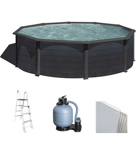 Forme Ronde, Nb maximal de personnes 9-10, Largeur piscine 460cm, Hauteur piscine 120cm, Hauteur max de l'eau 105cm, Capacité piscine 17450L, Pays de fabrication Espagne, Couleur piscine Graphite effet bois, Débit horaire max pompe 4000L/h, Filtre À sable, Échelle Incluse ...