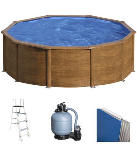Forme Ronde, Nb maximal de personnes 9-10, Largeur piscine 460cm, Hauteur piscine 120cm, Hauteur max de l'eau 105cm, Capacité piscine 17450L, Pays de fabrication Espagne, Couleur piscine Effet bois clair, Débit horaire max pompe 4000L/h, Filtre À sable, Échelle Incluse ...