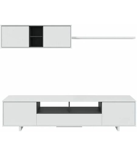 Description générale Ce meuble TV moderne, disponible en blanc brillant et gris anthracite, est conçu pour optimiser l'espace de votre salon tout en offrant une touche décorative. Avec ses lignes épurées et son design contemporain, il s'intègre parfaitement dans tout type de décoration intérieure. Il comprend un meuble bas avec 3 portes et un meuble haut avec 2 portes, ainsi qu'une étagère murale, offrant ainsi de multiples options de rangement pour votre télévision et vos objets personnels. Spécifications techniques Dimensions : 200 cm (largeur) x 46 cm (hauteur) x 41 cm (profondeur) Poids : 54 kg Matériau : Panneaux de particules mélaminés de haute qualité Épaisseur des panneaux : 15 mm et 30 mm Coloris : Blanc brillant et gris anthracite Fabrication européenne Compatibilité et accessoires Compatible avec la plupart des téléviseurs jusqu'à 40 kg Inclus : instructions de montage, matériel et outils nécessaires Installation Nécessite un assemblage Instructions détaillées fournies pour ...