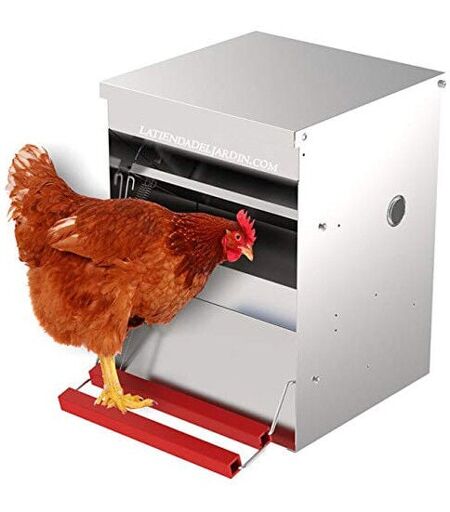 Mangeoire automatique pour oiseaux 6 Kg jusqu'à 3 poules Trémies de dernière génération pour poulets et oiseaux. Conçu pour empêcher les oiseaux ou les rongeurs d'accéder à la nourriture. Fabriqué en tôle galvanisée et profilés en PVC sur la pédale d'entraînement, qui permet aux poules de s'ouvrir lorsqu'elles se perchent. Caractéristiques du produit : Conçu pour jusqu'à 3 poules Fabriqué en tôle galvanisée et profilés PVC Pédale d'entraînement pour ouverture par les poules Capacité de 6 kg de nourriture Questions fréquemment posées : Comment empêcher les oiseaux ou les rongeurs d’accéder à la nourriture ? Cela est évité grâce à la conception spéciale de la trémie qui empêche l'accès aux autres animaux. Combien de poulets est recommandé par mangeoire ? Il est recommandé jusqu'à 3 poules par mangeoire de 6 Kg. Quel matériau est utilisé dans la fabrication de la mangeoire ? Des tôles galvanisées et des profilés en PVC sont utilisés. Quelle est la capacité alimentaire de la mangeoire ? ...