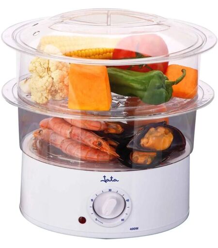 Cuisiner sainement. Il conserve toutes les propriétés et vitamines. Maintient la saveur naturelle des aliments. Minuterie de 60 minutes. Déconnexion automatique. 2 paniers transparents empilables. Capacité totale : 3,5 L. Capacité du réservoir d’eau 500 ml. Supports de grille pour la cuisson des œufs. Comprend un récipient pour le riz ou les sauces. LED. Couvercle transparent. Tension 230 V. Puissance 400 W. ...