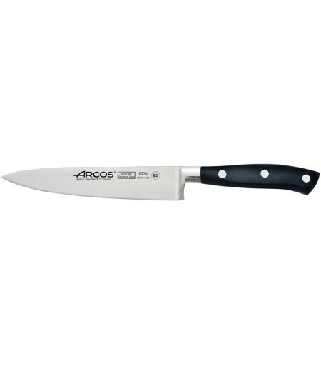 Longueur lame (mm) : 150 Acier : AIF Nitrum Couleur lame : Blanche Manche (Finition) : POM Couleur manche : Noir Profil de lame : Chef Tranchant : Lisse Verrouillage : Fixe Forgé d'une seule pièce, à virole style français Finition douce ayant une grande résistance aux produits corrosifs et aux hautes et basses températures (de ¿ 40°C à 150°C).Les rivets en acier inoxydable sont garantis à la corrosion ...