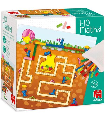 La boîte contient : 1 plateau de jeu, 40 réglettes de couleur du 1 au 10 et leur sac de rangement. Dès 3 ans. C'est maintenant facile d'apprendre aux bouts de choux à compter jusqu'à 10 grâce au jeu éducatif 1-10, Maths de Goula ! La règle est simple et amusante : chaque joueur dispose du même lot de 10 réglettes de tailles différentes qu'il va falloir disposer pour atteindre le centre de la fourmilière. Mais attention, il faut bien choisir pour pouvoir la poser sans sortir du chemin tracé ! Le premier à avoir déposé toutes ses réglettes ou à atteindre le centre de la fourmilière remporte la partie. A la fois ludique et pédagogique 1-10, Maths permet aux enfants de travailler sur l'ordre de grandeur, la représentation visuelle des chiffres de 1 à 10 et la logique. Il est idéal pour devenir un élève brillant ! ...