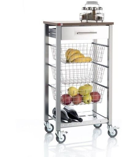 [img-1275-right-large_default]Très élégant et pratique, le chariot de cuisine ONDA offre du rangement supplémentaire et du style à la cuisine. Il dispose de trois paniers de grande capacité et d'un tiroir pratique pour ranger les aliments et les ustensiles de cuisine, tandis que la dernière étagère du bas est dotée d'une tablette pour ranger les bouteilles en toute sécurité.Structure en métal couleur aluminium, façade de tiroir en acier inoxydable.Plan de travail de particules recouvert d'un double stratifié mélaminé couleur cerisier.Façade et poignée du tiroir en acier inoxydable.Structure métallique revêtue d'une poudre polyester pour éviter la corrosion dans les environnements humides et garantir une longue durée de vie.L'acier inoxydable est doté d'un traitement spécial anti-traces de doigts (Easy-Clean). L'armoire est livrée avec un film protecteur sur les parties en acier inoxydable.Roulettes professionnelles de 75 mm. Roulettes frontales avec frein mécanique sur l'axe horizontal et vertical. Silencieuses et avec plaques anti-fil.Dimensions : 91 ( Hauteur ) 48,5 (Largeur ) 34 ( Profondeur ) cm.Livré déjà monté. Le chariot de cuisine ONDA est la meilleure solution pour rendre votre cuisine fonctionnelle. ...
