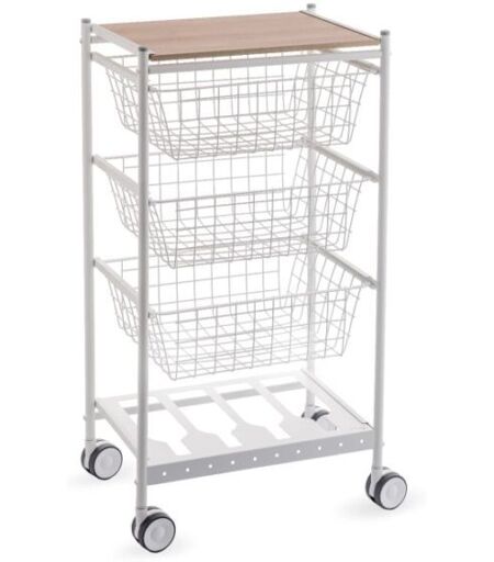 Vous cherchez un rangement supplémentaire pour la cuisine ou un petit meuble qui peut être déplacé entre la cuisine et le salon ? La desserte de cuisine KARINA est la solution idéale grâce à son esthétique et à sa capacité de stockage.Multifonctionnelle et d'excellente qualité, la desserte KARINA est le choix idéal pour les personnent qui aiment l'ordre et l'esthétique.Principales caractéristiques:Structure tubulaire et profilés en acier renforcé qui confèrent au meuble stabilité et robustesse.Laquée en blanc avec une texture mate. Peinture exempte de métaux lourds et d'éléments toxiques. 3 paniers en acier de grande capacité, entièrement amovibles et aux périmètres renforcés. La conception des trous dans les paniers permet une ventilation adéquate des fruits et légumes pour une meilleure conservation. Plan de travail de couleur hêtre. Avec cette étagère supérieure, vous disposez d'une surface de travail supplémentaire. Porte-bouteilles dans la partie inférieure du meuble.4 roues avec des composants anti-usure qui permettent de déplacer facilement le chariot dans la cuisine ou dans n'importe quelle pièce de la maison. Combinaison de métal et de bois. Son esthétique et sa distribution en font un meuble auxiliaire pratique également pour d'autres espaces de la maison comme le salon, les chambres à coucher et même les salles de bains.Le meuble est livré démonté. Montage rapide et facile grâce aux instructions de montage incluses. Nettoyage facile : utilisez un chiffon légèrement humide. Aucun produit de nettoyage chimique et/ou abrasif n'est nécessaire.Dimensions : 81 ( Hauteur ) 43,7 (Largeur ) 32,5 ( Profondeur ) cm.Fabrication espagnole avec des matériaux 100% recyclables, énergie 100% renouvelable certifiée, privilégiant l'économie durable de proximité.Profitez de tous vos fruits et légumes frais dans un seul et même meuble. Décorez votre cuisine avec des produits frais et naturels. Le meilleur cadeau pour la culture du régime végétalien.Desserte de cuisine KARINA - Rangement, qualité et capacité au meilleur prix. ...
