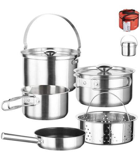 Inoxibar - batterie kamp 5 pièces + 2 couvercles + sac en acier inoxydable