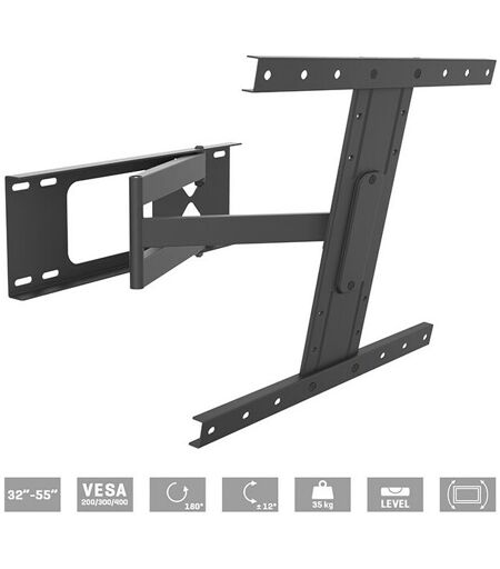 Supports muraux réglables pour écrans plats. CARACTÉRISTIQUES Support mural réglable pour écrans plats de 32" à 55" (81 à 140 cm). SUPPORT Bras double articulé Réglable horizontalement à 180º Réglable verticalement à ± 12º Distance au mur en position verticale : 4 à 61 cm Correction de l'inclinaison horizontale de l'écran Niveau à bulle COULEUR Noir POIDS SUPPORTS MAXIMAUX 35 kg MESURES Plaque TV réglable avec trous VESA standard 200/300/400 Plaque murale : 48 x 17 cm ...