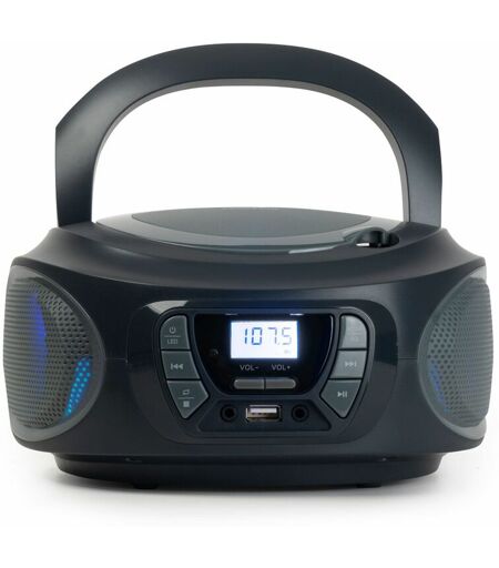 Radio CD FONESTAR BOOM-ONE-B finie en gris, avec effets de lumière, tuner numérique FM avec 30 présélections, écran LCD, connecteur USB/MP3, entrée auxiliaire et sortie casque et puissance de 2 x 2 W RMS. Portable car il fonctionne avec des piles ou branché sur le secteur. ...