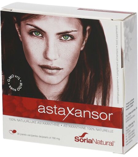 Complément alimentaire à utiliser dans le cadre d’une alimentation variée, équilibrée et d’un mode de vie sain.L’Astaxansor est un produit innovatif d’origine végétale qui grâce à son taux élevé de vitamine C et E et des minéraux comme le zinc et le sélénium, aide à protéger les cellules contre le stress oxydatif. Le zinc contribue au maintien d’une peau normale et la vitamine C contribue à la formation normale du collagène ce qui contribue à une fonction normale de la peau. Le zinc contribue au maintien d’une vision normale.Bénéfices:Contribue à une vision normaleContribue à la formation de collagèneContribue à la protection contre le stress oxydatifComposition:Gélatine (perle), huile de lin 150 mg (Linum usitatissum L., semence) de première pression à froid, acide L-ascorbique (vit. C), huile de soja 80 mg (Glycine max L., semence), extrait d’algues 80 mg (Haematococcus pluvialis Flotow) riche en astaxanthine, extrait de tagète 50 mg (Tagetes erecta L., fleur) avec 5% de lutéine, extrait sec de canneberge 36,67 mg (Vaccinium macrocarpon Aiton, fruit), sulphate de zinc, stabilisant (perle): cire d’abeille, extrait de tagète 10 mg (Tagetes erecta L., fleur) avec 5% de zéaxanthine, émulsifiant (perle): lécithine de soja et glyceryl monostéarate, dl-alpha-tocophérylacétate (vit. E), humectant (perle): glycérine, colorant (perle): oxyde de fer, cholécalphérol (vit. D), sélénite de sodium.Valeur nutritionnelle: Par perleAJR*Astaxanthine4 mg Lutéine10 mf Zéaxanthine1 mg Proanthocyanides2,2 mg Vitamine C92,9 mg116%Vitamine D6,5 µg130%Vitamine E5,5 mg 46%Sélénium55 µg 100%Zink10 mg100%* AJR: Apport journalier de référenceConseil d'utilisation:1 perle par jour.Précautions d'emploi:Ne pas utiliser pendant la grossesse ou l'allaitement. A partir de 12 ans. Ne pas dépasser la dose journalière recommandée. Ne pas laisser à la portée des jeunes enfants. À conserver à l’abri de la lumière, de la chaleur et de l’humidité.Poids net:30 perlesFabricant:Soria Bel NVRinglaan 358480 Ichtegem ...