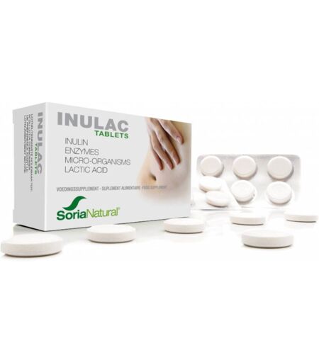Complément alimentaire à utiliser dans le cadre d’une alimentation variée, équilibrée et d’un mode de vie sain.L’inulac contient des prébiotiques en forme d’inuline, une source d’énergie qui stimule la formation des bactéries vivant et une fibre qui favorise le transit intestinal.Contient des bactéries vivant à enrobage entérique, pour une flore intestinale optimale.Contient des enzymes d’ananas et de papaye pour une bonne digestion.ACTION QUADRUPLE:aide avec les ballonnementsdigestion doucerétablit la flore intestinaletransit régulierComposition:Inuline, fructose, malt, poudre d'ananas (bromélaïne), papaye (papaïne), Lactobacillus acidophylus, Lactobacillus caseï, Bifidobacterium bifidum, acide lactique, acide citrique (régulateur d'acidité), cellulose (liant), stéarate de magnésium (anti-agglomérant)Valeur nutritionnelle: Pour 1 compriméInuline950 mgMalt200 mgAnanas90 mgPapaye75 mgLactobacillus acidophylusLactobacillus caseïBifidobacterium bifidum1 x 10^9 cfuConseil d'utilisation:1 comprimé après le repas.Précautions d'emploi:Il est conseillé de ne pas dépasser la dose journalière recommandée. Tenir hors de portée des jeunes enfants. Conserver dans un endroit frais et sec.Poids net:60 g = 30 comprimés à sucerFabricant:SORIA BEL NVRinglaan 358480 IchtegemBelgique ...