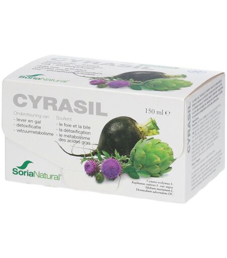 Complément alimentaire à utiliser dans le cadre d’une alimentation variée, équilibrée et d’un mode de vie sain.Cyrasil est une formule complète et unique à base d'extraits standardisés à large spectre de radis noir, d'artichaut, de chardon-Marie et de desmodium pour contribuer à une bonne fonction hépatique et biliaire*.Grâce à la méthode de production unique, toutes les enzymes qui sont autrement perdues pendant la production, sont conservées, ce qui garantit une efficacité très élevée.* Allégation de santé en attente d’approbation par l’EFSA.Quand l'utiliser ?Cyrasil peut être conseillé à tous ceux qui veulent soutenir leur foie et leur fonction biliaire de façon naturelle ou à ceux qui désirent faire une cure dépurative. Le produit peut être utilisé à partir de 5 ans.IngrédientsBouchon: lécithine de SOJA avec phosphatidylcholine (159,4 mg), maltodextrine et dioxyde de silicium (agent antiagglomérant).Flacon: glycérine végétale (agent mouillant), sucre de canne brut non raffiné, eau, jus concentré de radis noir (Raphanus sativus L. var. nigra, racine) (1657 mg) (10:1), extrait liquide d'artichaut (Cynara scolymus L., feuille) (532 mg) (1:1) et chardon marie (Silybum marianum L. Gaertn, graine) (532 mg) (1:1), acide citrique (régulateur d'acidité), arôme citron.Allergènes : Soja.Conseils d'utilisation1 ampoule par jour, le soir dans un grand verre d'eau.Précautions d'emploiConserver dans un endroit frais et sec.Tenir hors de portée des jeunes enfants.Ne pas dépasser la dose recommandée.Ne convient pas aux femmes enceintes ou pendant l'allaitement.Poids net150 ml℮Adresse du FabricantSoriaBelRinglaan 358480 IchtegemBelgique ...