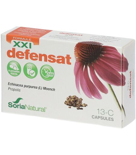 Complément alimentaire à utiliser dans le cadre d’une alimentation variée, équilibrée et d’un mode de vie sain.Qu’est-ce que Defensat XXI?Defensat XXI est un complément alimentaire à base des substances naturelles propolis et échinacée. 1L’échinacée contribue à une bonne résistance. Defensat XXI est idéal pour utiliser pendant les mois d’hiver. Ce complément est facile à utiliser grâce à sa libération prolongée.Quel est la composition?Le Defensat XXI est composé de propolis et d’échinacée. 1L’échinacée contribue à une bonne résistance. Les composants principaux de l’échinacée sont les alkylamides, l’échinacoside (dérivé d’acide caféique) et les polysaccharides tels que le rhamno-arabinogalactane et l’échinacine. L’échinacée contient aussi de la vitamine C, des flavonoïdes, des pentosanes, des fibres et des minéraux comme le zinc. Nous utilisons de la propolis lyophilisée, qui garantit un produit de haute qualité, avec préservation des substances thermolabiles. Nous utilisons aussi de la technologie cyclodextrine patentée, qui assure une assimilation élevée et une meilleure stabilité.Quand l’utiliser?Le Defensat XXI peut être conseillé à toute personne à partir de 5 ans qui à besoin de renforcer sa résistance et son système immunitaire, et souhaite se protéger. Ne convient pas aux femmes enceintes ou allaitantes.Combien en utiliser?L’utilisation recommandée est de 2 gélules par jour. 1 gélule le matin et 1 gélule le soir offrent 24h d’efficacité. La libération prolongée permet un effet profond et durable. Les ingrédients sont enrobés et libèrent une quantité suffisante de principes actifs toutes les 3 heures selon la taille des microgranules. La présence constante des substances actives dans le plasme augmente l’efficacité.Bénéfices:Propres plantations biologiques à 1200 m d’altitudeProtection pendant 24 heures grâce à la libération prolongéeExtraits Turbo Dynamiques avec une concentration plus élevée d’ingrédients actifsExtraits lyophilisés avec rétention des enzymes thermolabilesMeilleure capacité d’absorption grâce à la technologie cyclodextrineExtraits standardisés avec une efficacité thérapeutique optimaleStabilité augmentée grâce à la micro-encapsulationComposition:Stabilisant: cellulose microcristalline, extrait sec d’échinacée 150 mg (Echinacea purpurea (L) Moench, racine) (5:1), extrait sec de propolis 150 mg 4:1, alpha-cyclodextrines, agent d’enrobage: copolymère de méthylacrylate neutre, gélule: hydroxypropylméthylcellulose.Valeur nutritionnelle: Pour 1 gélule AJR*Flavonoïdes10,8 mg dérivés d’acide caféïque 0,3 mg *Apport journalier de RéférenceConseil d'utilisation:2 gélules par jour, 1 gélule le matin et 1 gélule le soir.Cure d'entretien:1 gélule par jour le matin.Précautions d'emploi:Conserver dans un endroit sec et à l’abri de la lumière. Tenir hors de portée desjeunes enfants. Ne pas dépasser la dose recommandée.Ne pas utiliser pendant la grossesse ou l'allaitement. A partir de 5 ans.Poids net:19,2 g = 30 gélulesFabricant:Soria Bel... ...