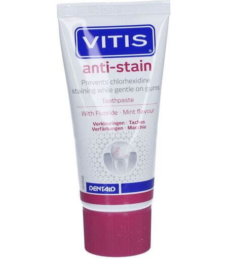 Vitis Anti-Stain DentifriceLors de traitements avec des bains de bouche à la chlorhexidine, une décoloration des dents peut se produire en raison d'interactions avec des aliments tels que le café, le thé ou le vin rouge, mais aussi le tabac, par exemple. Les patients arrêtent souvent d'utiliser les bains de bouche à la chlorhexidine avant l'heure par crainte d'une décoloration. Cela peut entraîner des risques supplémentaires pour la santé, des coûts plus élevés et une gêne accrue pour le patient.VITIS Anti-Stain prévient la décoloration sans affecter l'action de la chlorhexidine. Le produit est doux, n'abrase pas et respecte les gencives. Il convient donc parfaitement aux patients ayant subi un traitement dentaire chirurgical qui doit être suivi d'un bain de bouche à la chlorhexidine.Indication Efficacité préventive contre la décoloration des dents pendant le traitement à la chlorhexidine (CHX). Patients sujets à la décoloration des dents. Les facteurs de risque de décoloration sont élevés pour : (paro) les patients ayant une mauvaise hygiène bucco-dentaire, les fumeurs et la consommation fréquente de café, de thé et de vin. Action anti-tartre ApplicationIl est recommandé d'utiliser le dentifrice VITIS Anti-Stain deux fois par jour pendant l'utilisation d'un bain de bouche à la chlorhexidine (CHX). 1. Brosser les dents avec le dentifrice anti-taches (1 à 2 cm suffisent).2. Rincer la bouche avec de l'eau après le brossage3. Rincer la bouche avec un bain de bouche contenant de la CHX Conseil : se brosser les dents avec le dentifrice anti-taches VITIS lors de l'utilisation d'un produit PERIO-AID. La formule unique de ce dentifrice est très efficace et prévient la décoloration après l'utilisation de la chlorhexidine. Le dentifrice est également doux pour les gencives. Ingrédients2% Polyvinylpyrrolidone (PVP)1,1 % Monofluorophosphate de sodium3% Système de double phosphate : Hexamétaphosphate de sodium Tripolyphosphate de sodium1% xylitol0,4 % Sulfate de sodium et de lauryleFluorure 1450 ppm ...